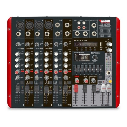 NOVIK NVK 800P USB Consola Mezcladora Amplificada / 8 Canales / 4 XLR / 2 Canales Estereo / 300W + 300W RMS / 99 Efectos 24 bits / EQ Grafico de 7 Bandas / BLUETOOTH / Mp3 / Phantom Power